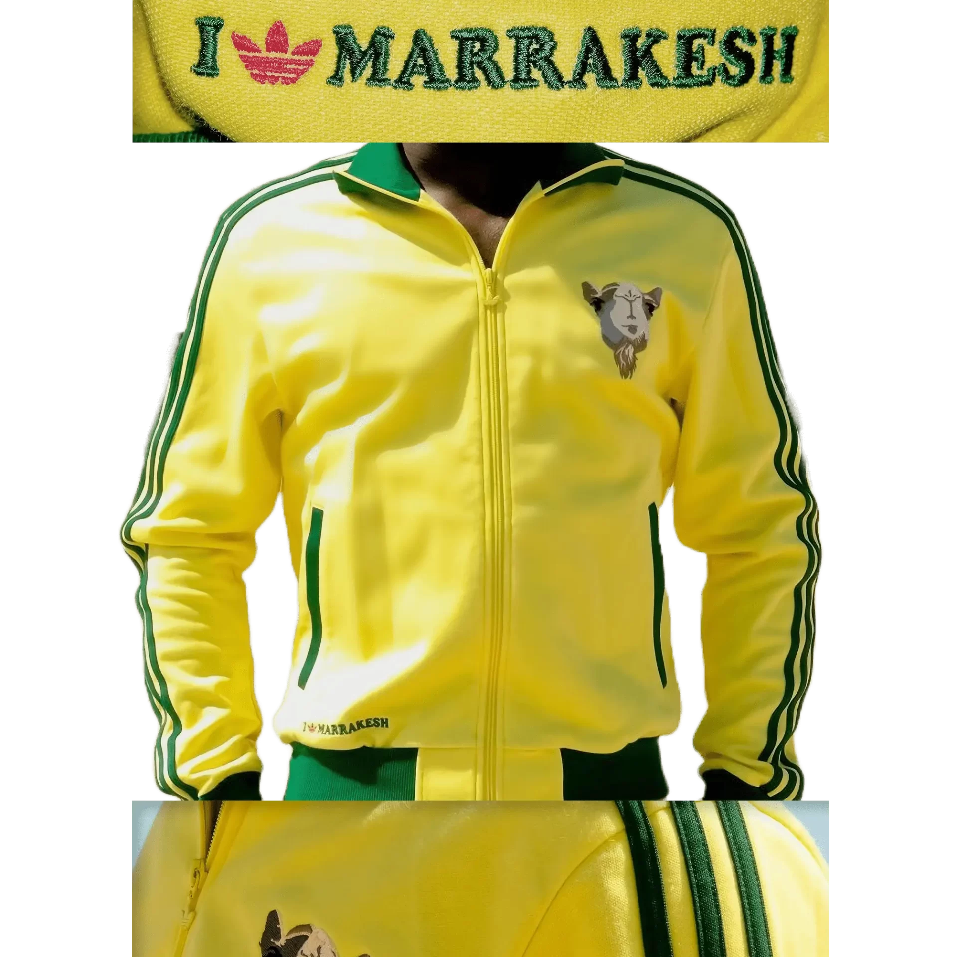 The Marrakech Track Top pays homage to the vibrant city of Marrakech, with the word "love" replaced by the trefoil logo. In a fade yellow with green stripes, this jacket showcases a camel as the city's icon on the front chest. The ART number is: 650421.