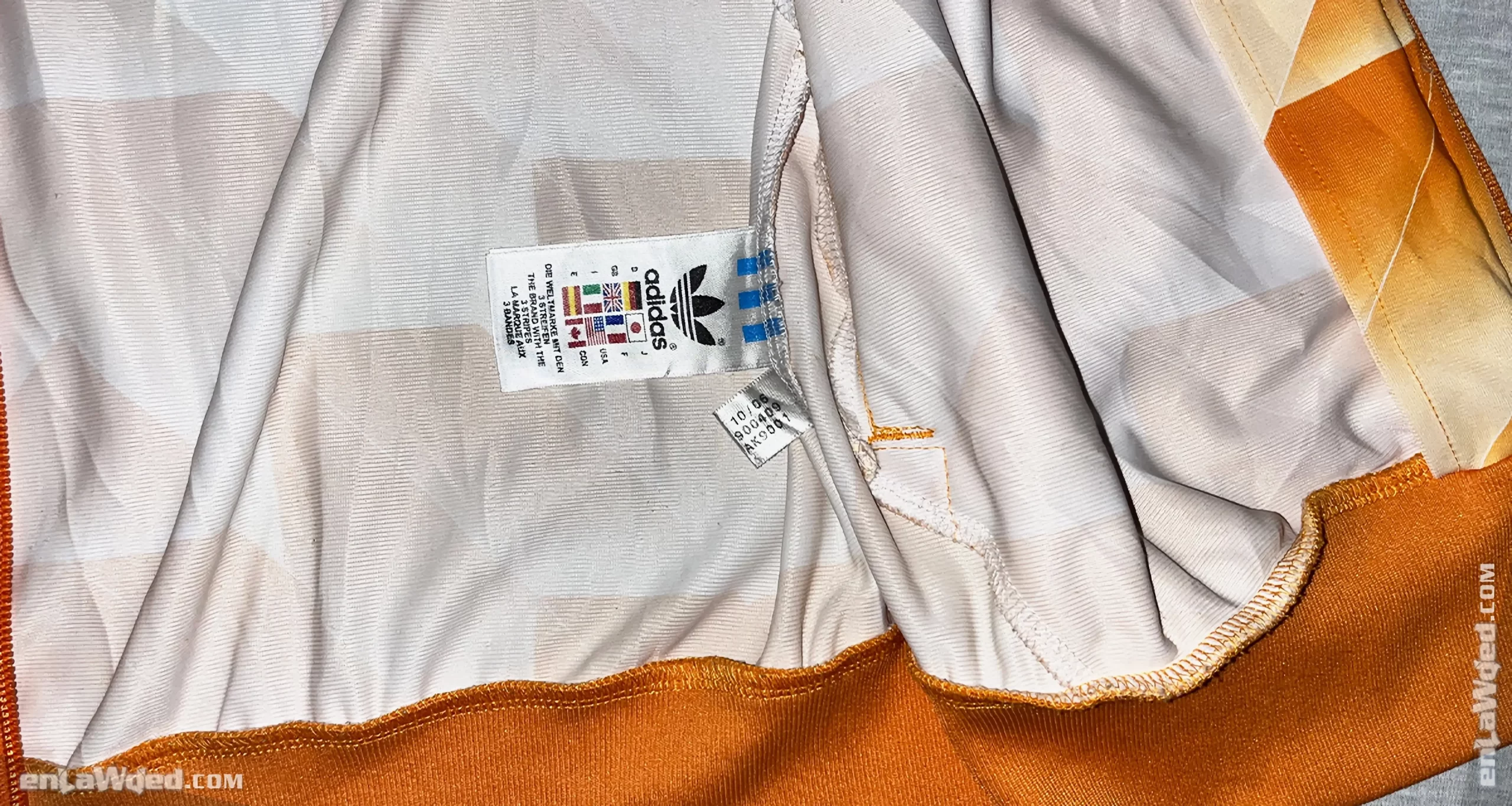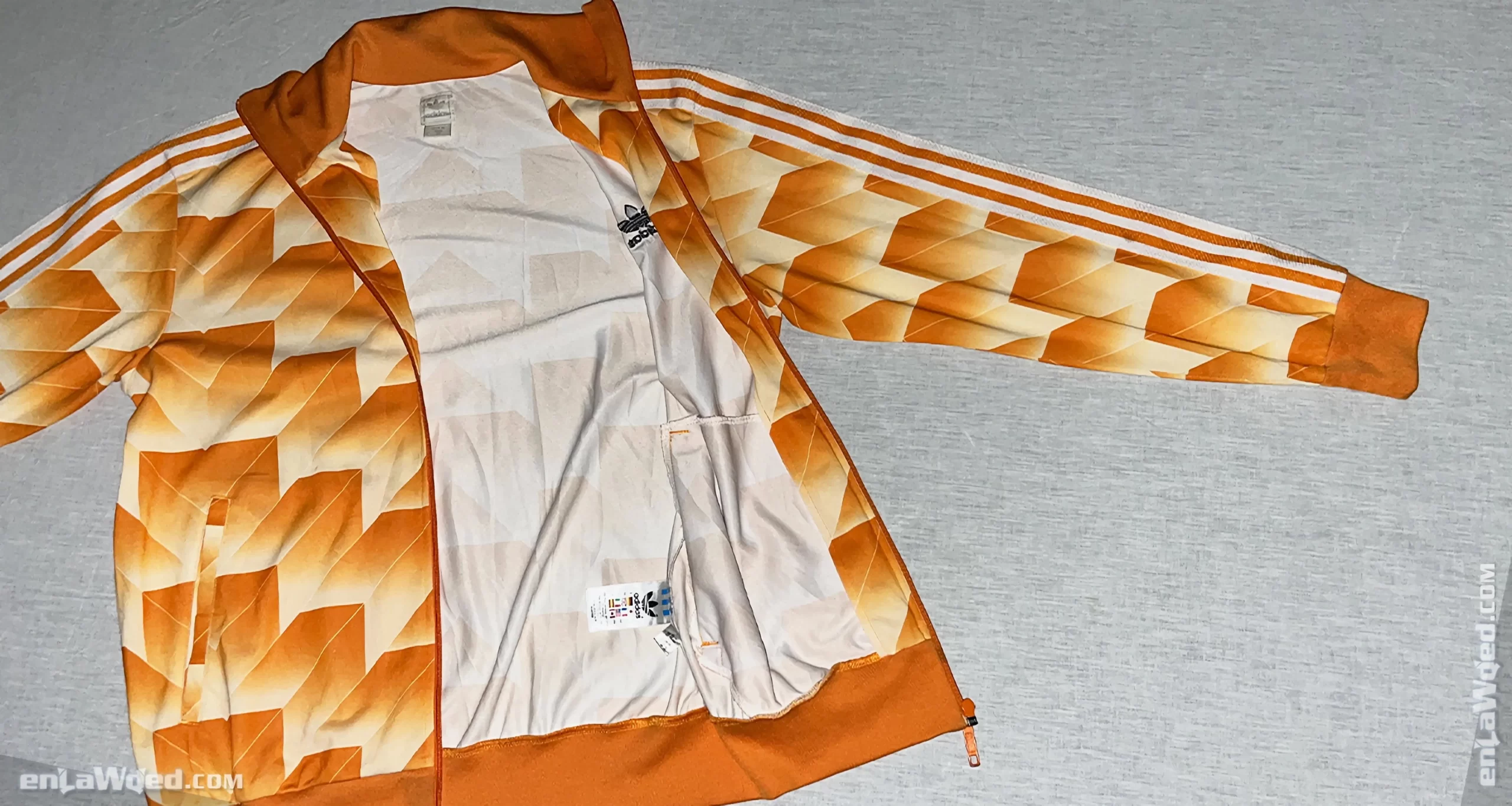 Featuring the original and bold pattern, called Ipswich Template, and worn in most of the Dutch games of the 1988 UEFA European Championship, when the Netherlands won the tournament for the first time, this orange and white Adidas Originals jacket is a must-have. The ART number is: 900409. Here are four links that the owner discovered while researching the Adidas Ipswich template editions: link 1, link 2, link 3 and link 4.